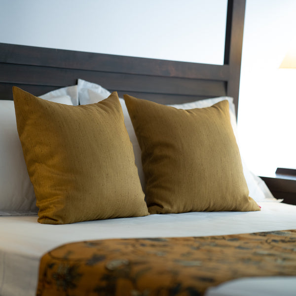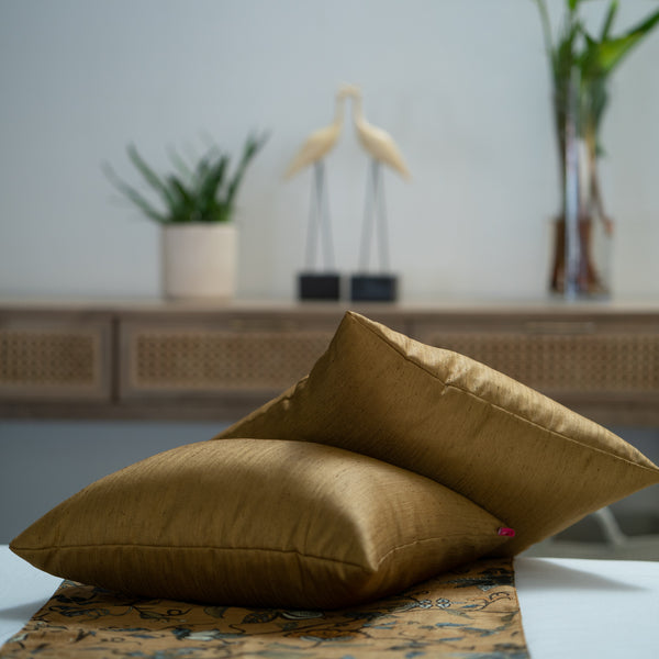 2 piece cushion cover set - contains two medium sized cushions made of art silk. suitable for use in living/family room sofas, diwans, lounge chairs, sit out chairs, study chairs,bedroom etc. Ideal to create a refined look of luxury.