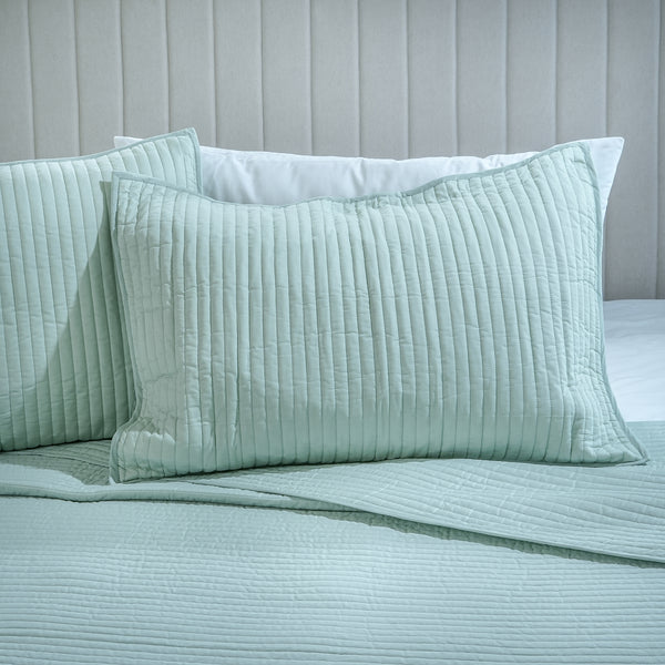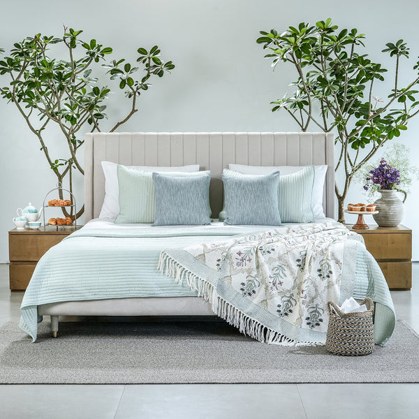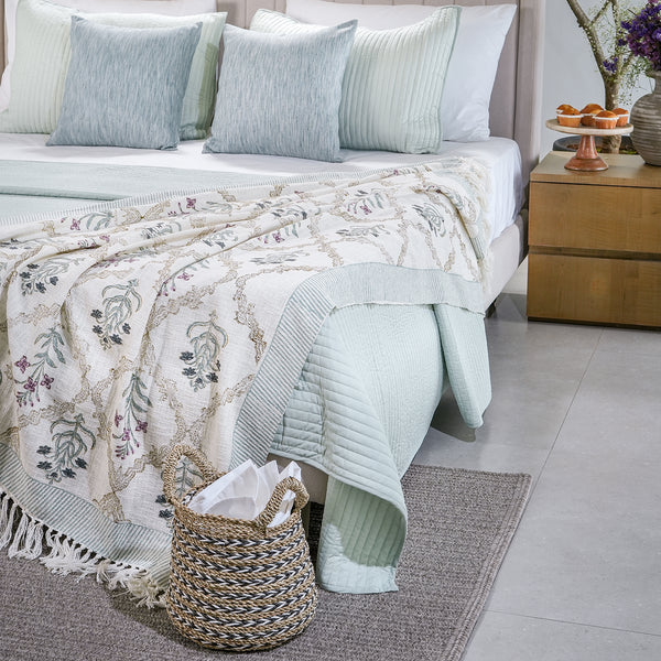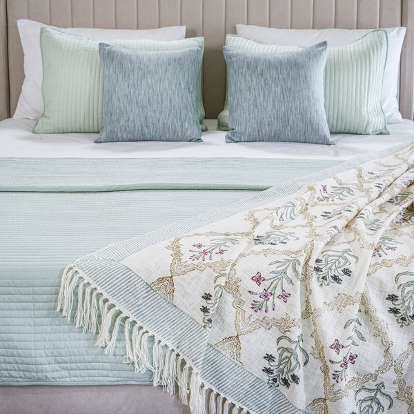 Breakfast bliss bedding set with quillted cotton bedspread, polysilk cushions and handblock throw in pastel green