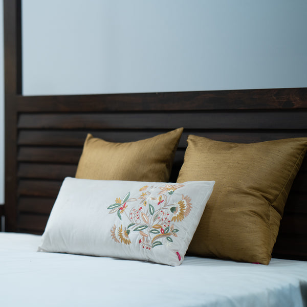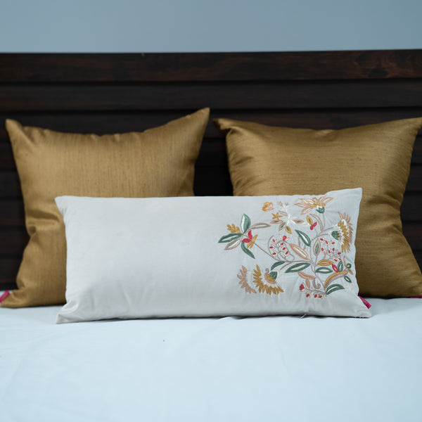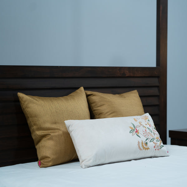 ITEM: 3 piece cushion set - Medium square sized, set of two cushions in art silk fabric in mustard yellow color is paired with medium rectangle sized, single cushion in velvette fabric in dull off-white color with floral thread embroidery work on it .  SKU: OB/PK/SAM-01  Stylist note :  This set of three cushions imparts a deep, rich look to your interiors. They are ideal for modern chic or luxurious interiors. They can also be used in a classic interior setting along with antique furniture. The floral embroidery motifs have persian inspiration.  It can be used as part of your bedding or can...