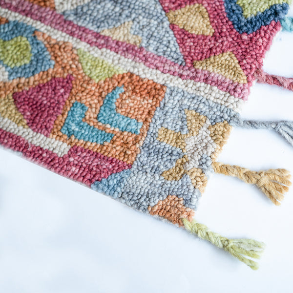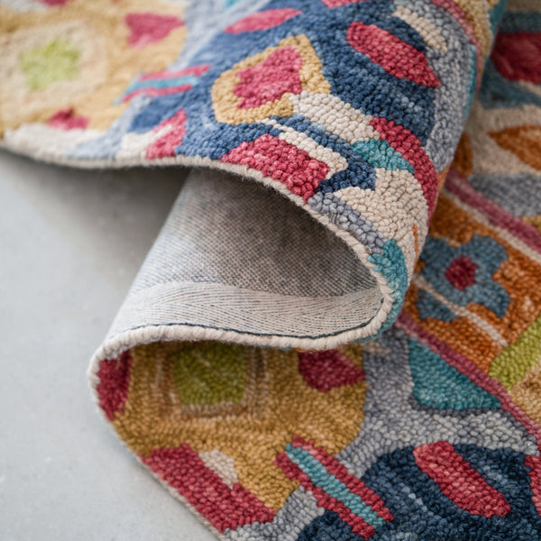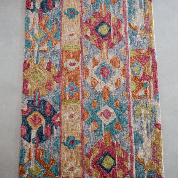 Single piece designer carpet - Handtufted carpet of medium pile height of 0.5'',made of 100 percent wool with looped composition in color combinations of rose,dark red,cream,teal,mustard,medium gray,lime,camel and denim.  Stylist Note: This beautiful designer carpet is very unique in its color shades and texture and appearance. It comes with one of the best hue combinations with eclectic patterns and rustic finish.One of our heart throbbing statement pieces. It imparts a modern classic & refined luxurious look to your interiors. It can accentuate any space, be it your living room, dining or bedroom.