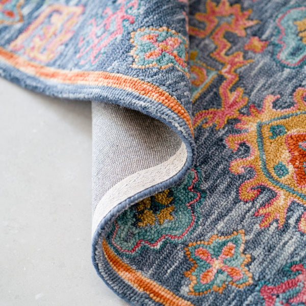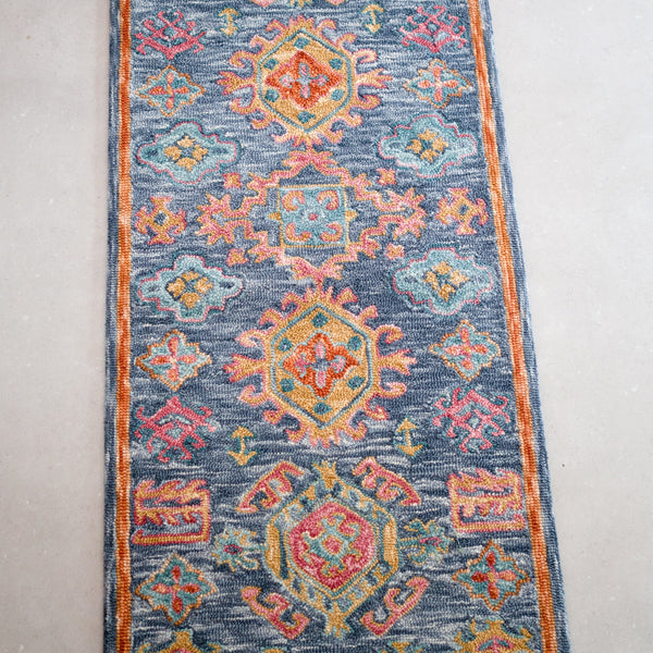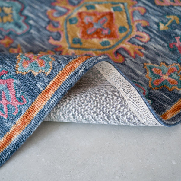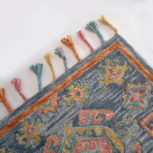 Single piece - Handtufted carpet of medium pile height of 0.5'',made of 100 percent wool with looped composition in color combinations of rose,dark red,cream,teal,mustard,medium gray,lime,camel and denim.    Stylist Note: This beautiful designer carpet is very unique in its color shades and texture and appearance. It comes with one of the best hue combinations with eclectic patterns and rustic finish.One of our heart throbbing statement pieces. It imparts a modern classic & refined luxurious look to your interiors. It can accentuate any space, be it your living room, dining or bedroom.