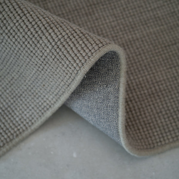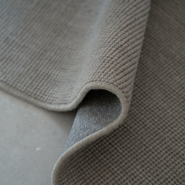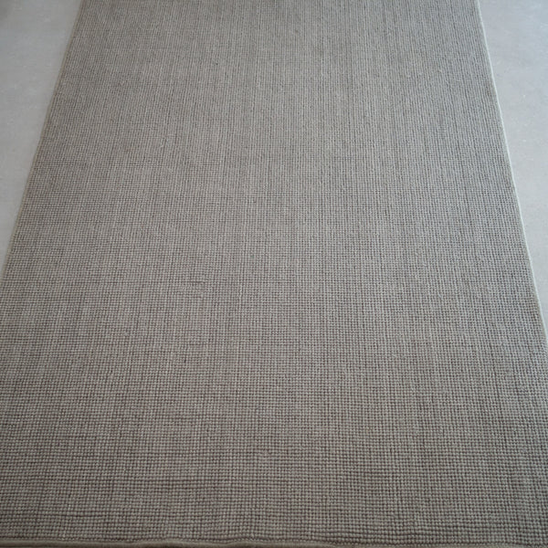 Single piece carpet -100% wool,hand loomed and a pile height of 6.7mm. .It's a loop wool construction with amazing color combinations that visually creates depth and dimension. It features a serged finish and has a backing of melange cotton canvas. Suitable for adorning your living,dining,family and bedrooms. Serves as an element to bring a modern persian vibe to the interiors.