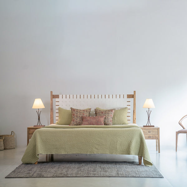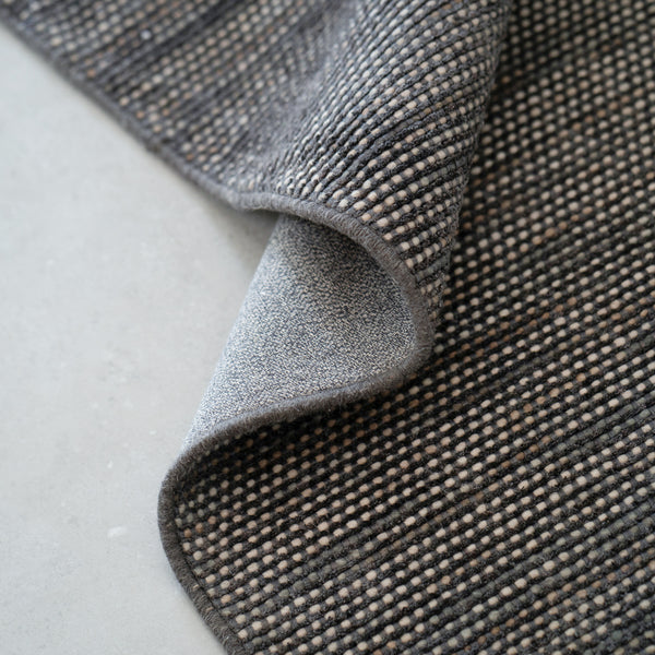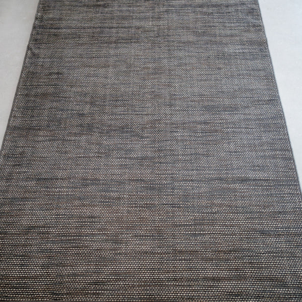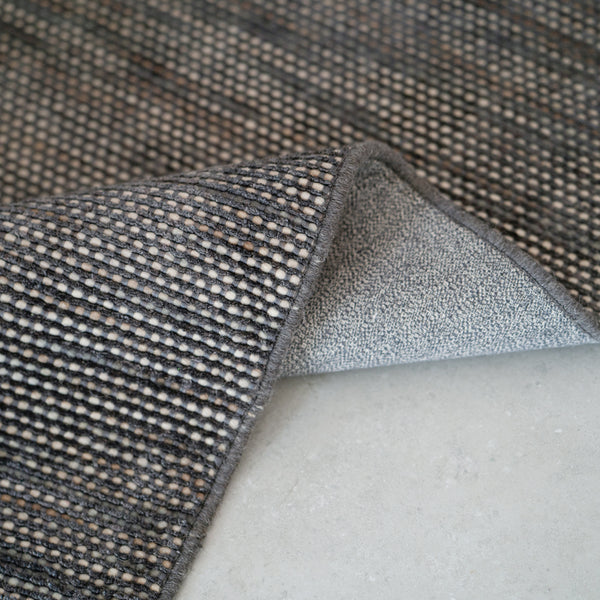 Single piece carpet features a pile composition of wool and viscose, hand loomed to a medium height of 5.6mm. It is dyed in multi-colored wool cord and woven in a linear pattern between rows of soft viscose. It features a serged finish and has a backing of melange canvas. Carpet is suitable for adoring your living, dining, and bedrooms, providing a solid and deep modern look.