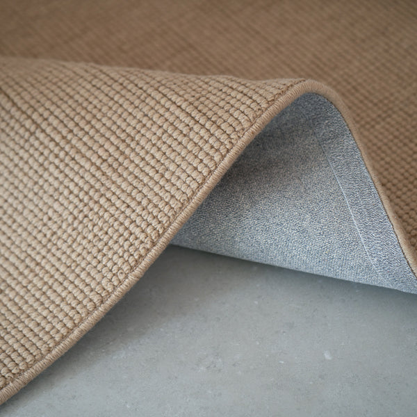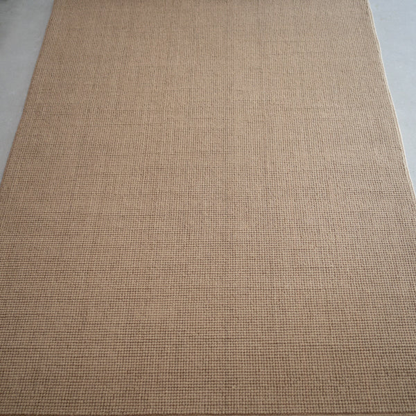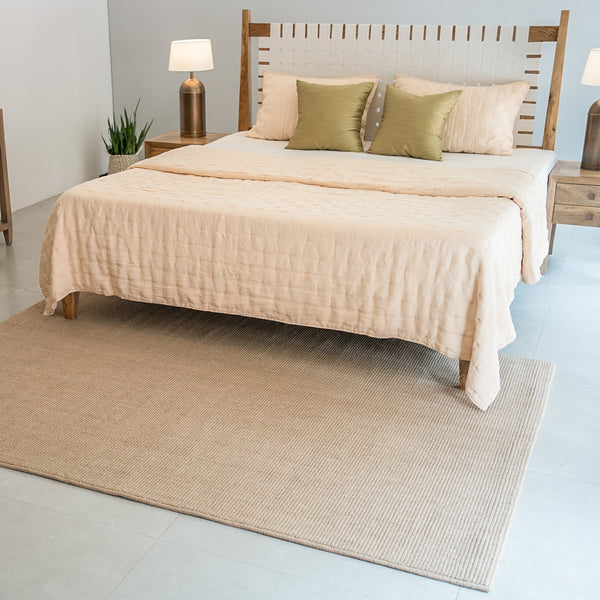 Single piece carpet -100% wool,hand loomed and a pile height of 6.7mm. .It's a loop wool construction with amazing color combinations that visually creates depth and dimension. It features a serged finish and has a backing of melange cotton canvas. Suitable for adorning your living,dining,family and bedrooms. Serves as an element to bring a modern persian vibe to the interiors.