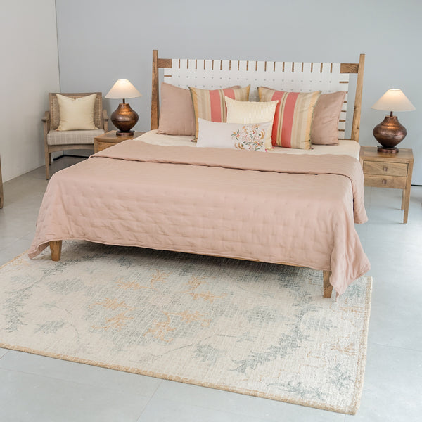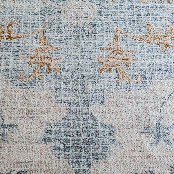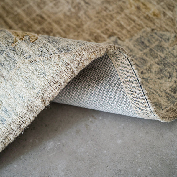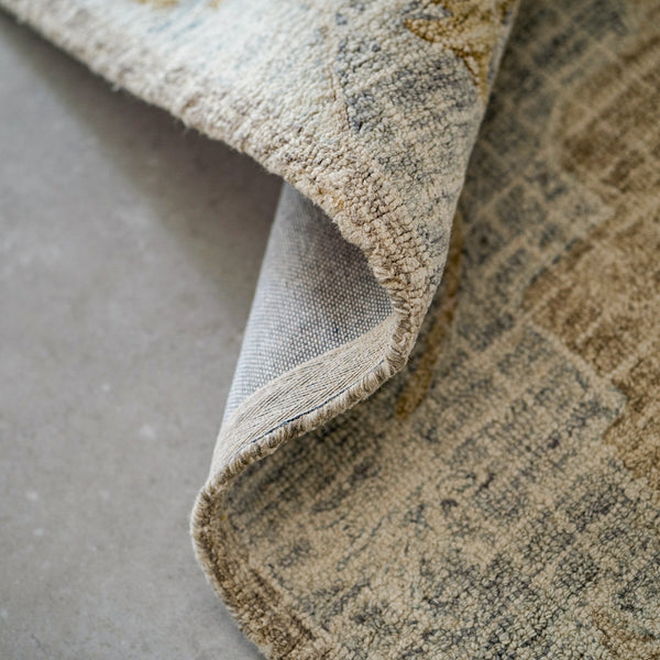 Single piece designer carpet -100% wool,handtufted and of low pile height of 0.3". Carpet comes in a mix of shades of medium gray,teal,khaki,cream,sea foam,dark green,wheat. Suitable for adorning your living,dining,family and bedrooms. Serves as an element to bring a modern persian vibe to the interiors.