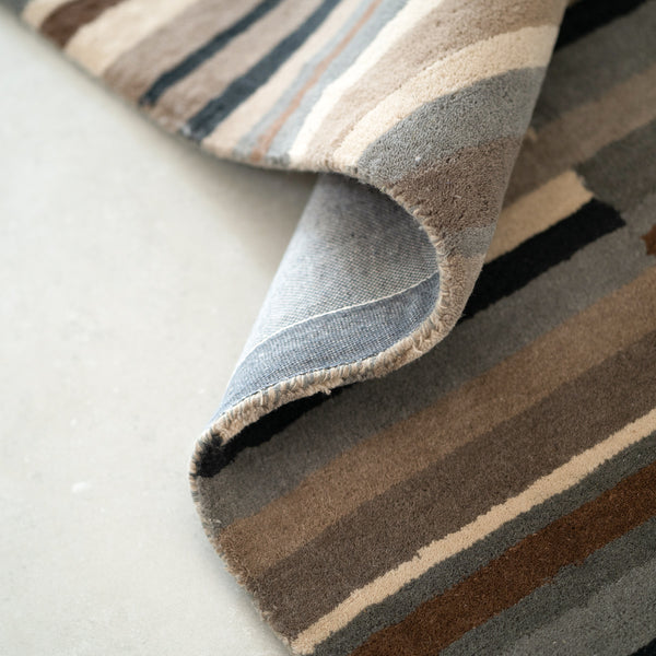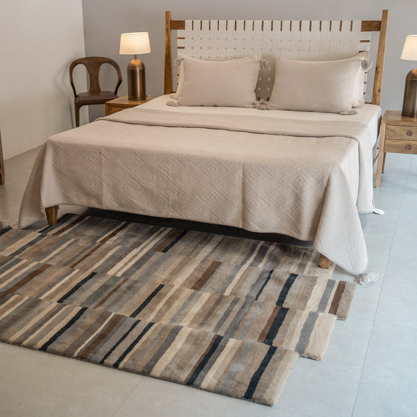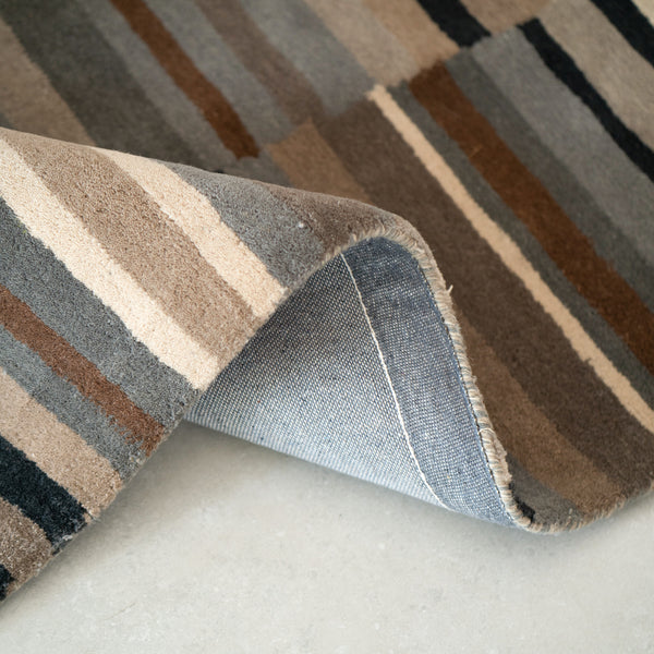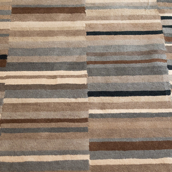 Single piece designer carpet -100 percent wool,handtufted of medium pile height of 0.39". It's a modern stylish design with shaped edges in shades of camel,charcoal,cream,brown,gray and black. Suitable for adorning your living,dining,bedrooms and study spaces. It can be used as a highlighter element for your interiors revolving around a contemporary theme. This carpet is definitely a fashion statement.