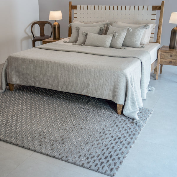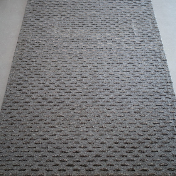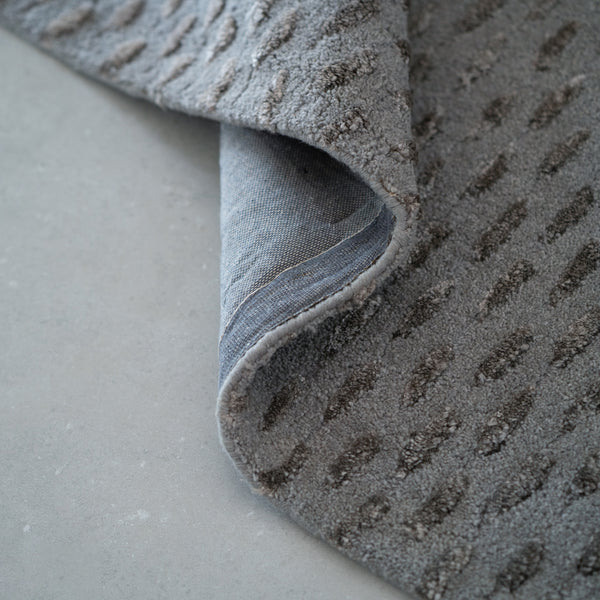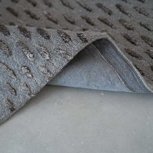 Single piece designer carpet -50% wool & 50% viscose,handtufted and of medium pile height of 0.39". Hard twist texture and in shades of medium gray and taupe. Suitable for adorning your living,dining,family and bedrooms. Gives a solid and deep modern look.