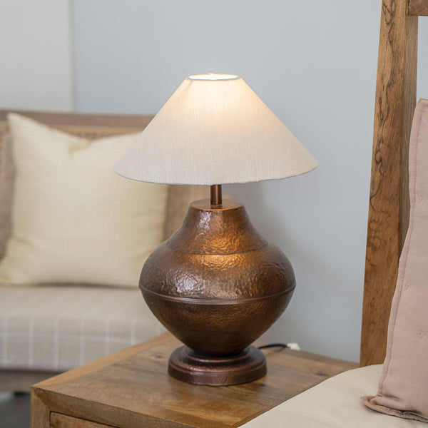 10 piece styled bedroom set - contains one bedding set with king size cotton satin quilted premium bedspread with two pillows and four cushions in art silk and hand embroidery - contains one large size handtufted wool designer carpet - contains two table lamps in copper finish with beaten antique semi matt polish.