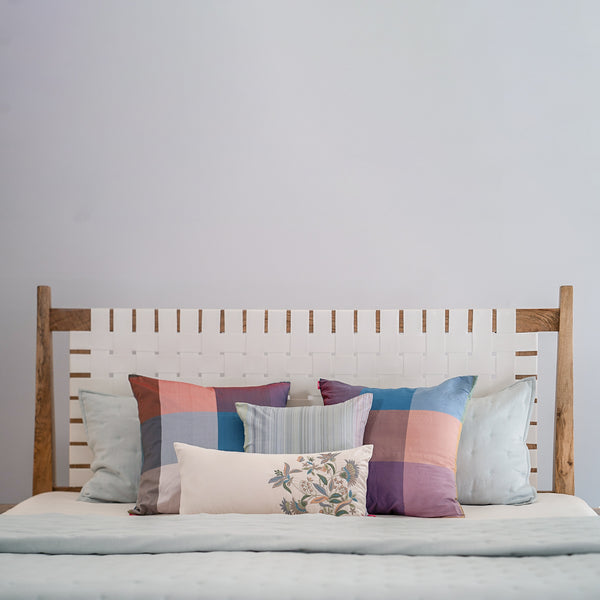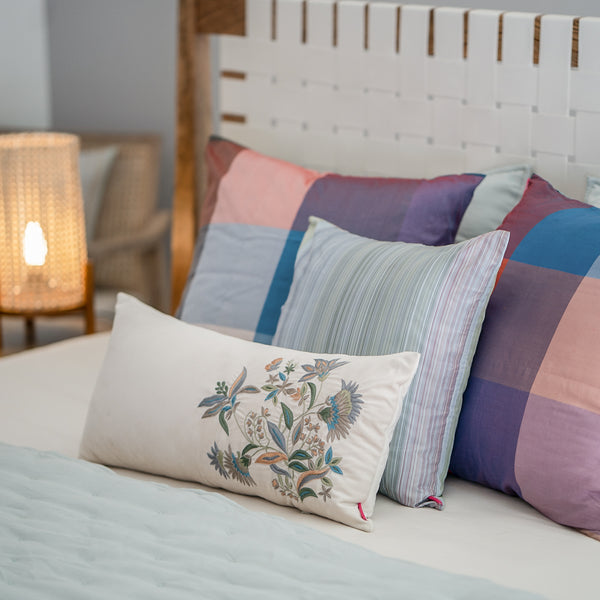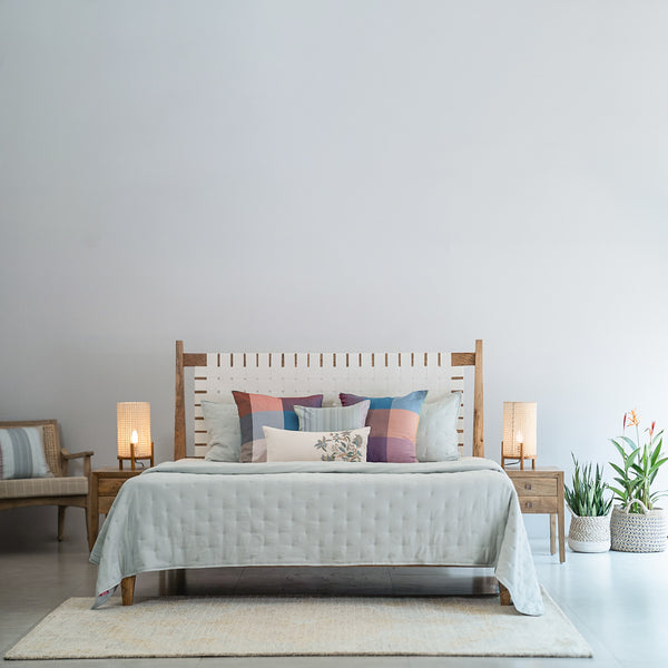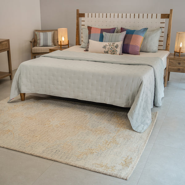 10 piece styled bedroom set - contains one bedding set with king size cotton satin quilted premium bedspread with two pillows and four cushions in art silk and hand embroidery - contains one large size handtufted wool designer carpet - contains two table lamps in rattan cane finish with wooden legs.