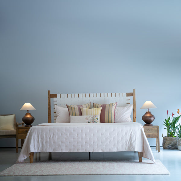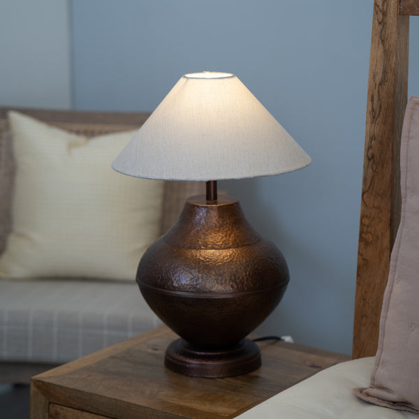 1 piece Table lamp with fabric shade - Table lamp with metallic base in brass metal finished with beaten copper antique polish in semi-matt finish and provided with fabric shade in off white colored raw cotton silk with grey tinge.