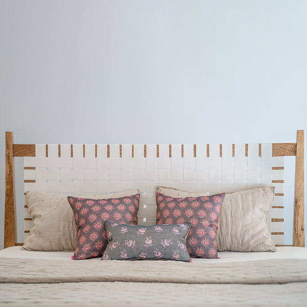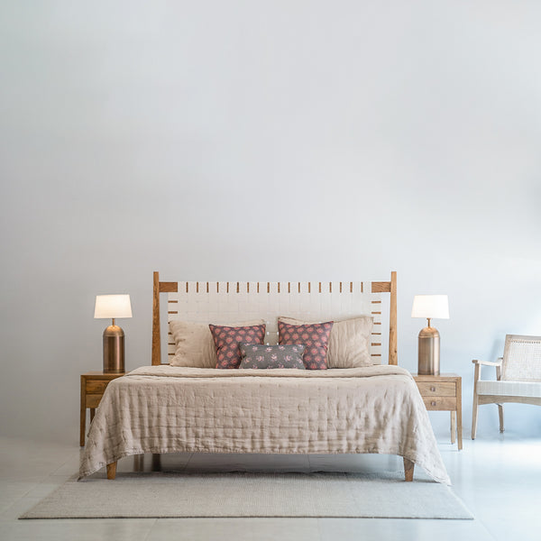 9 piece styled bedroom set - contains one bedding set with king size linen quilted bedspread with two pillows and three cushions in chanderi silk - contains one large size wool designer carpet - contains two table lamps in brass metal finish with plain antique semi matt polish.