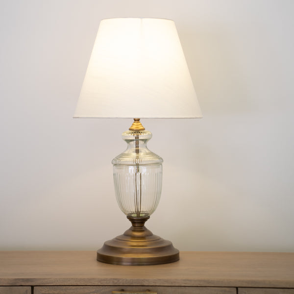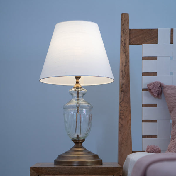 1 piece Table lamp with fabric shade - Table lamp in glass with metallic base in brass metal finished with plain antique masafi polish in semi-matt finish and provided with fabric shade in off white colored raw cotton silk.