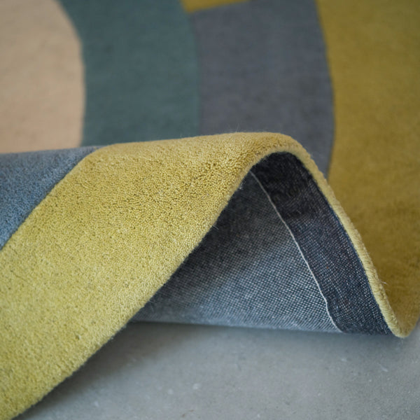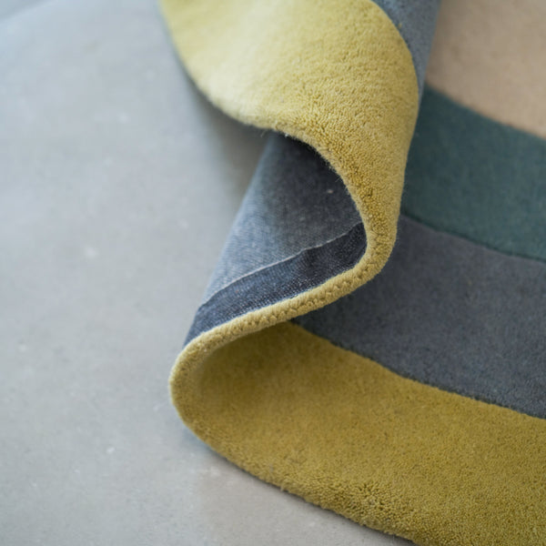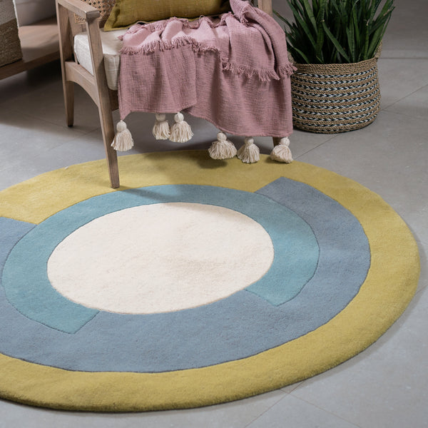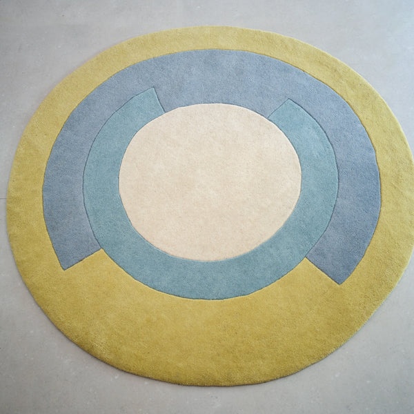 Single piece designer carpet -Round shaped,100 percent wool,handtufted & handcarved of medium pile height of 0.39". It's a modern design in round shape of 5 ft diameter and in shades of lime green,blue and cream. Suitable for adorning your living,dining,family, kids bedroom and study spaces. It can be used as a highlighter element for your interiors revolving around a contemporary theme.