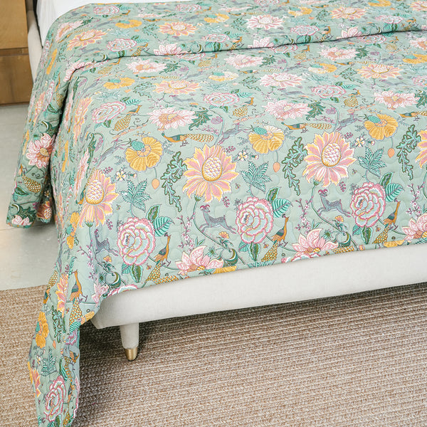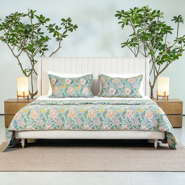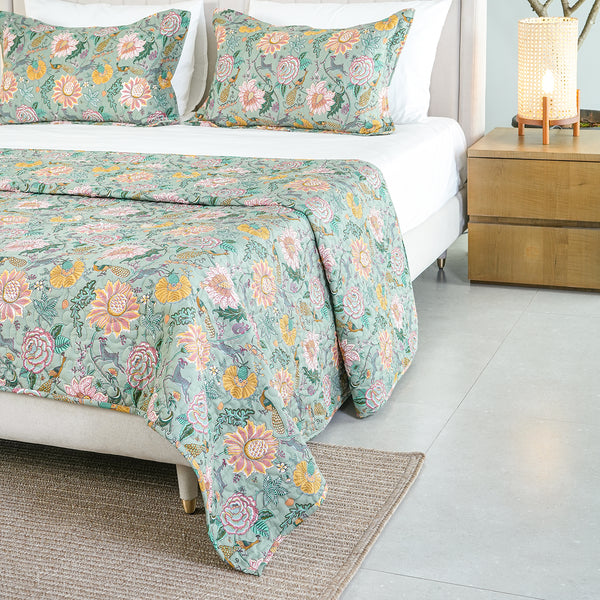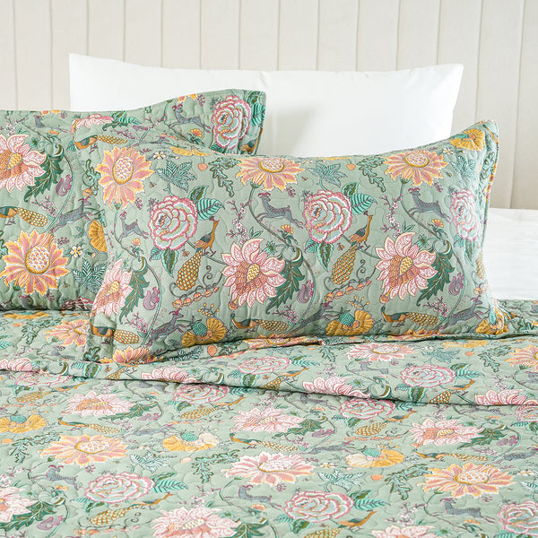Quilted cotton printed bedspread with pillows in multicolor - green